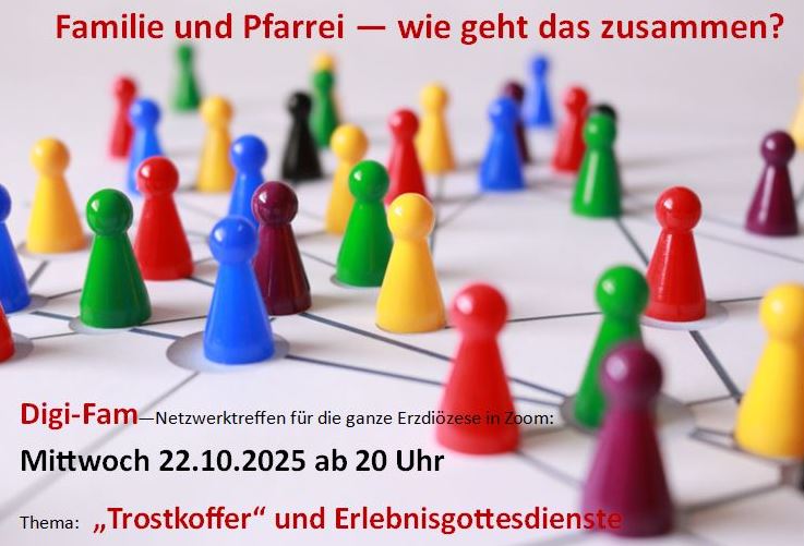 Das nächste digitale Netzwerktreffen findet am Mittwoch, den 22.10.2025 ab 20:00 Uhr via Zoom statt. Neben Impulsen und Austausch rund um die Familienpastoral stehen diesmal die Themen „Trostkoffer“ und Erlebnisgottesdienste auf dem Programm.